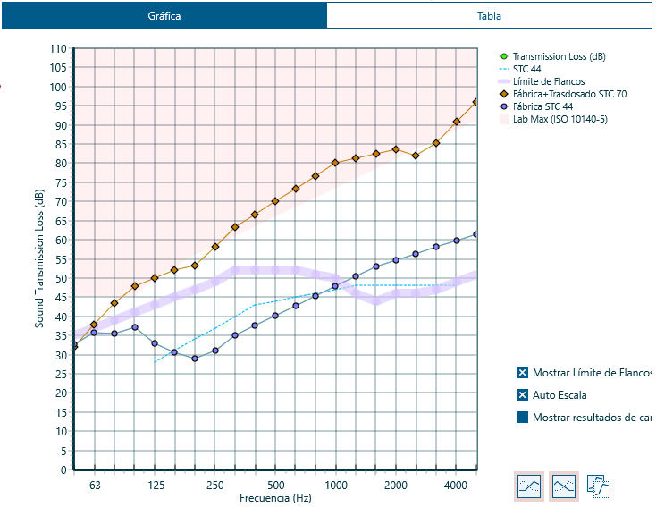 Tras haber establecido los dos elementos comparativos, INSUL representa gráficamente el índice de reducción acústica aparente de cada uno.
