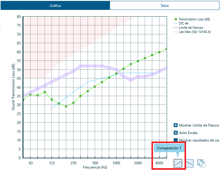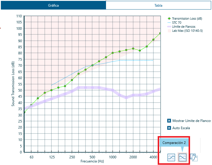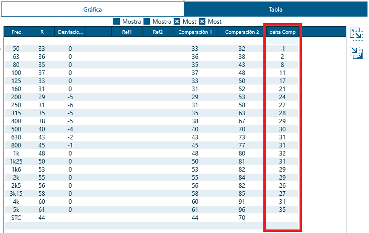 En la pestaña "Tabla" se puede obtener la diferencia entre ambos índices de reducción acústica aparente por bandas de 1/3 de octava.
