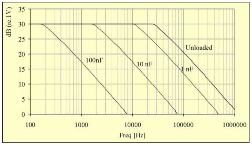 A continuación, se pueden ver diferentes conjuntos de curvas en la respuesta en frecuencia para diferentes capacitancias de cable: