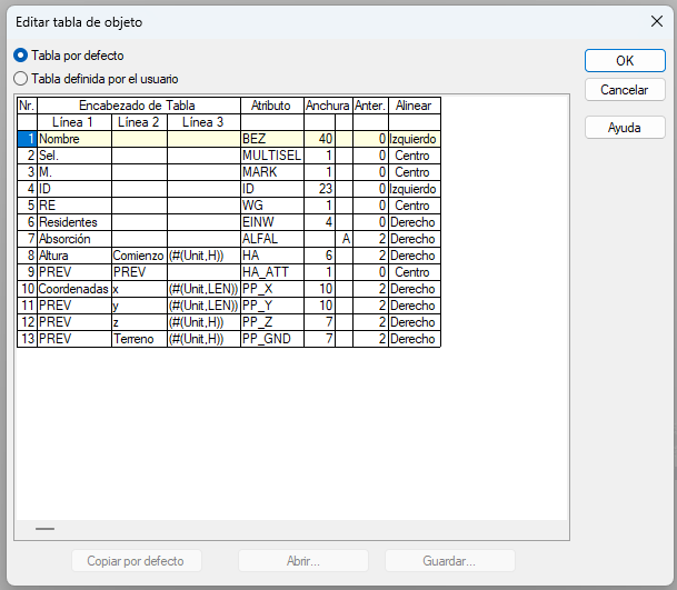 Al pulsar Tabla…, CadnaA muestra o permite modificar los atributos que se exportarán: